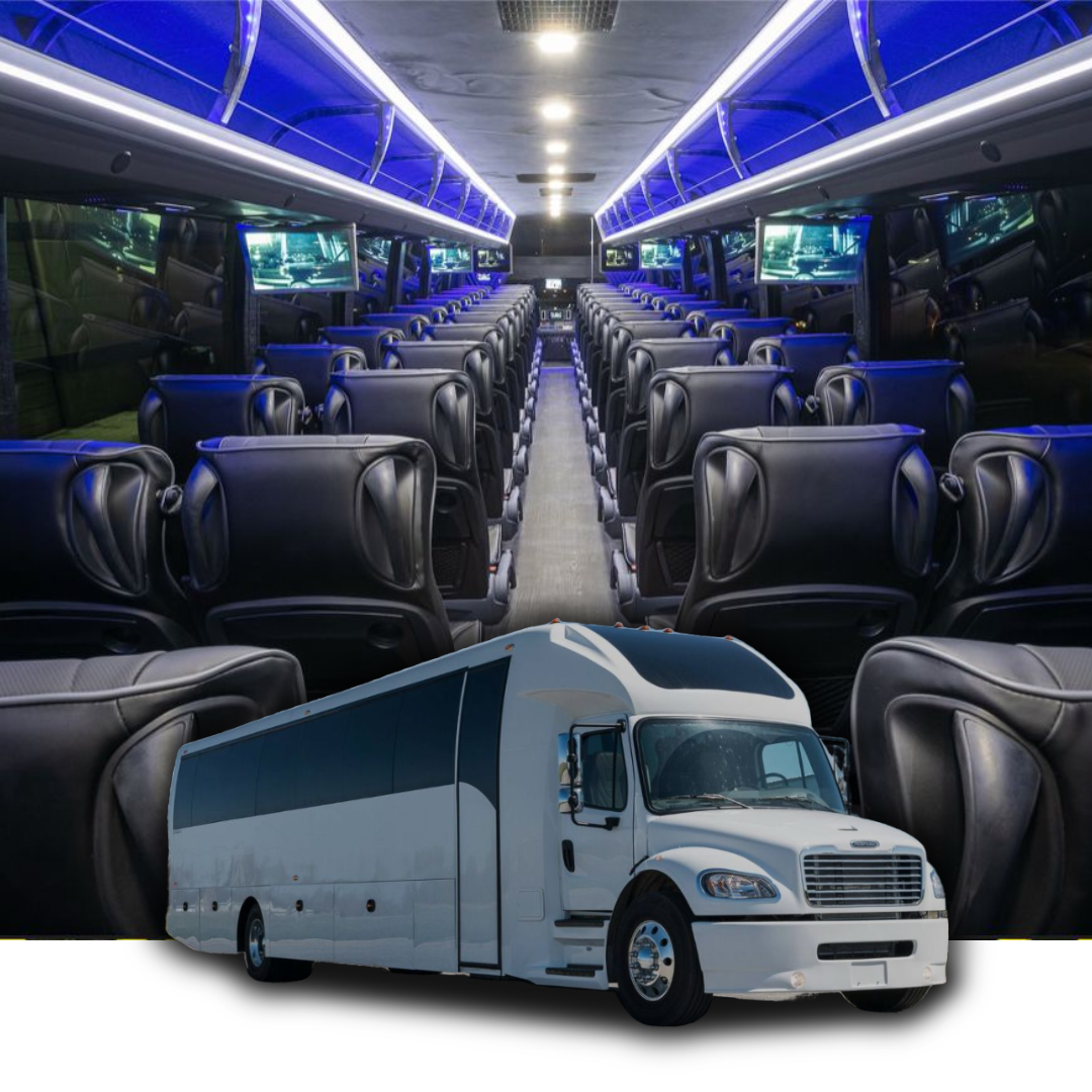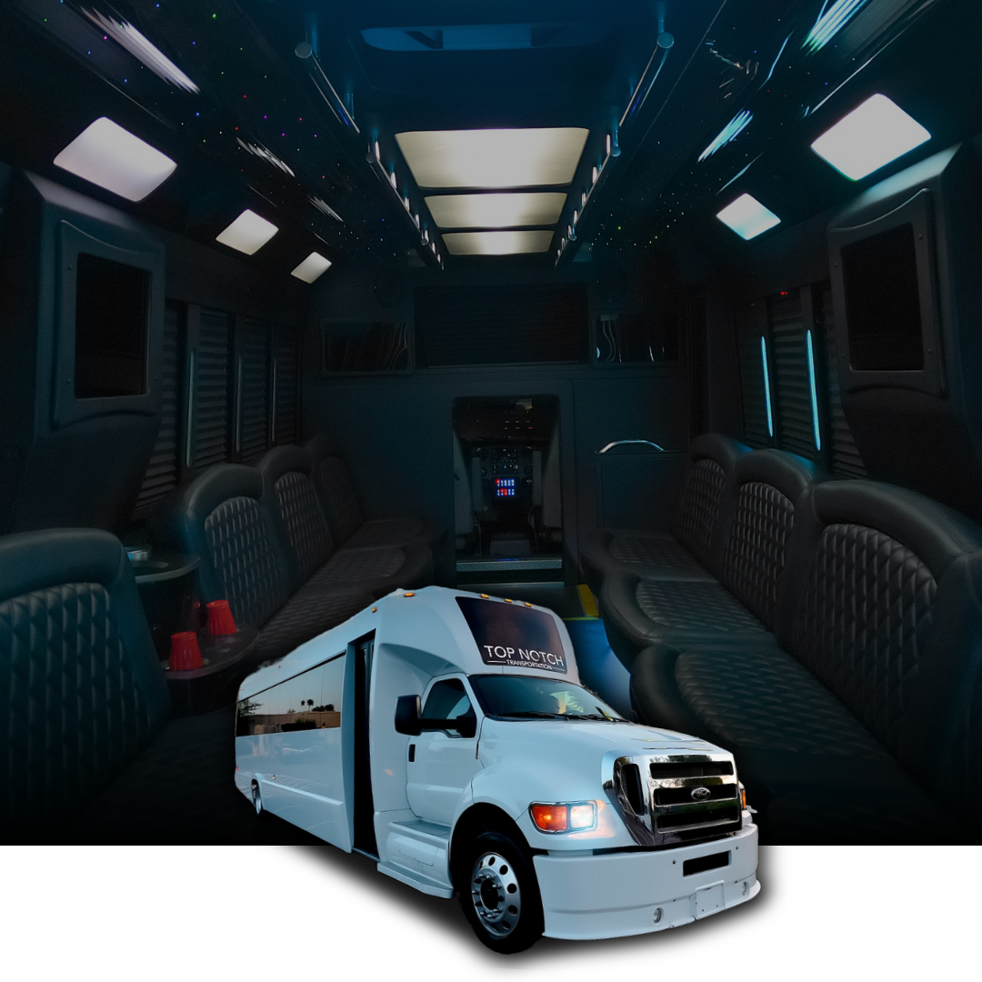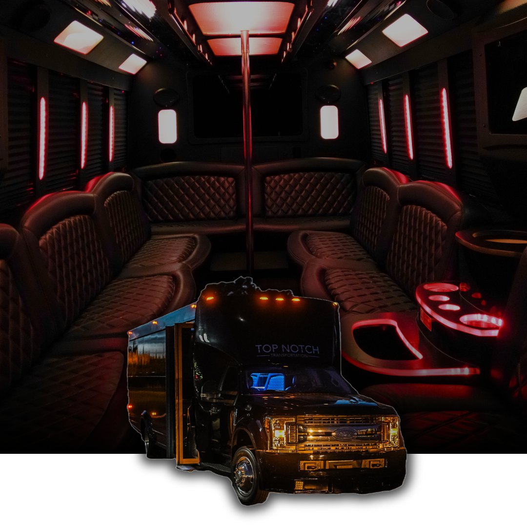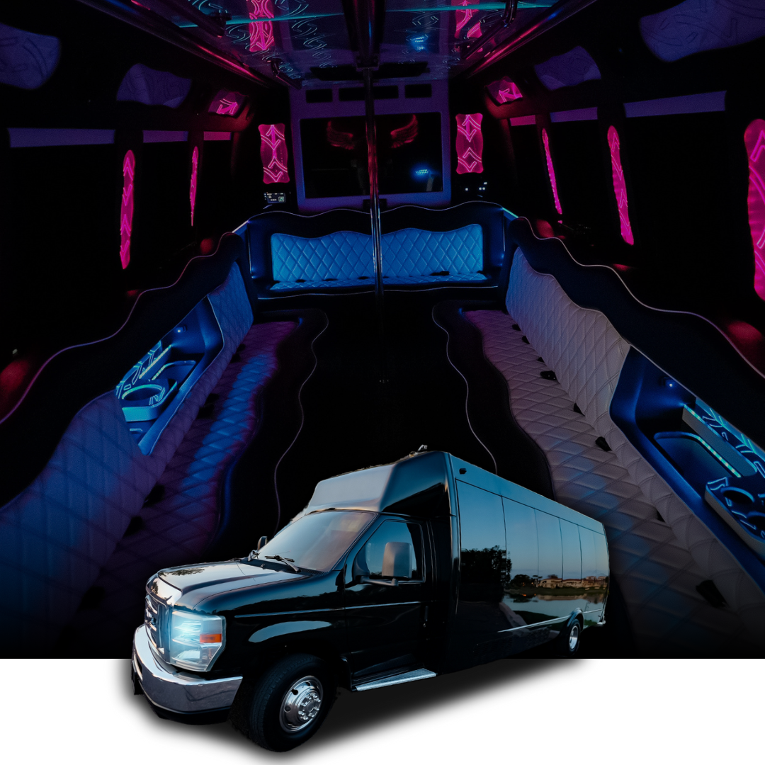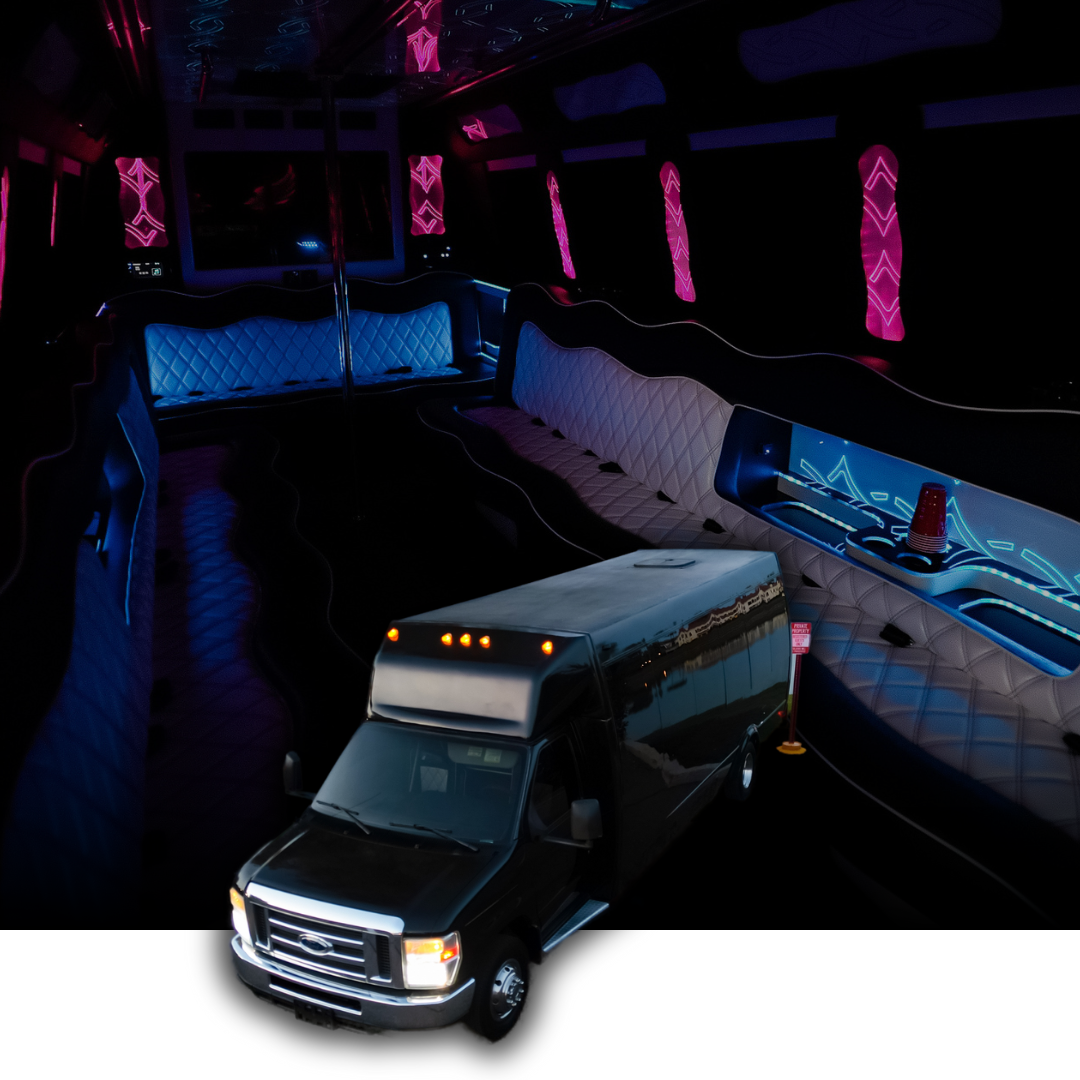 Party Buses (16-40 Passengers): Premium party buses with entertainment systems, LED lighting, bar areas, and celebration-ready interiors perfect for large fan groups, corporate outings, and game day parties traveling to Footprint Center.