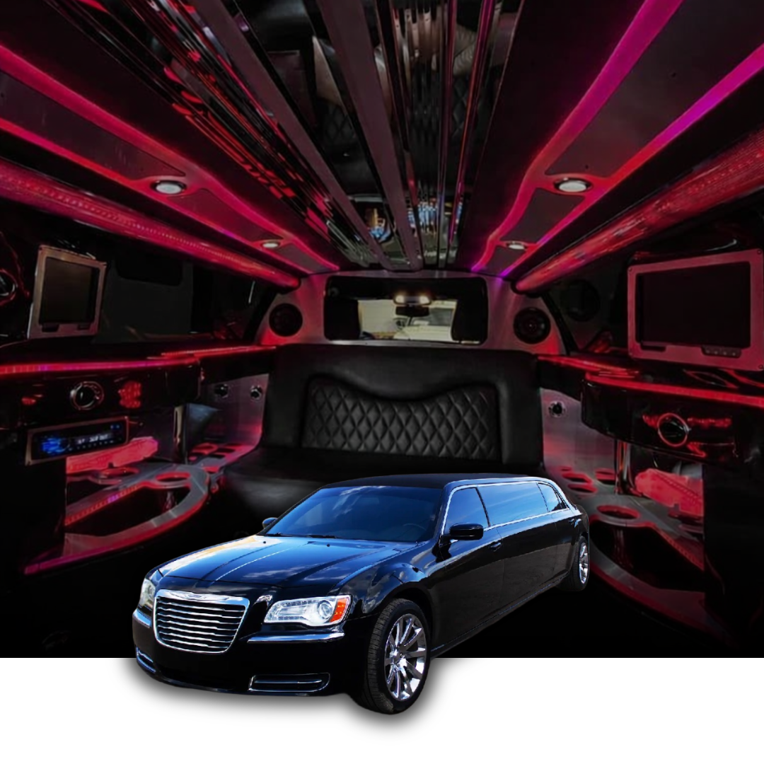 Introducing the Chrysler 300 Stretch Limo—where iconic American style meets intimate luxury for up to 6 passengers. This sleek black beauty features plush leather seating arranged face-to-face, perfect for connecting with friends while you celebrate. With its sophisticated mood lighting reminiscent of Maybach starlight ceilings, premium entertainment systems, and built-in bar console, this ride transforms any occasion into an unforgettable experience.